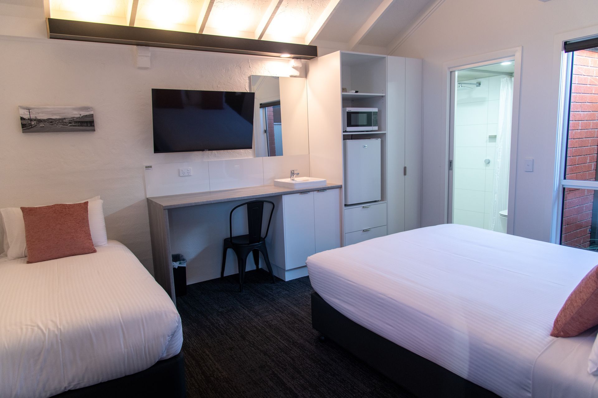 Discover a haven of convenience in every room. From a fully equipped kitchenette with a fridge/freezer, microwave, kettle, and toaster, to all the essentials like cutlery, plates, bowls, and glasses, we've got you covered. Experience the perfect temperature year-round with reverse-cycle air-conditioning and refresh in style with rain showers and modern fixtures in our bathrooms.